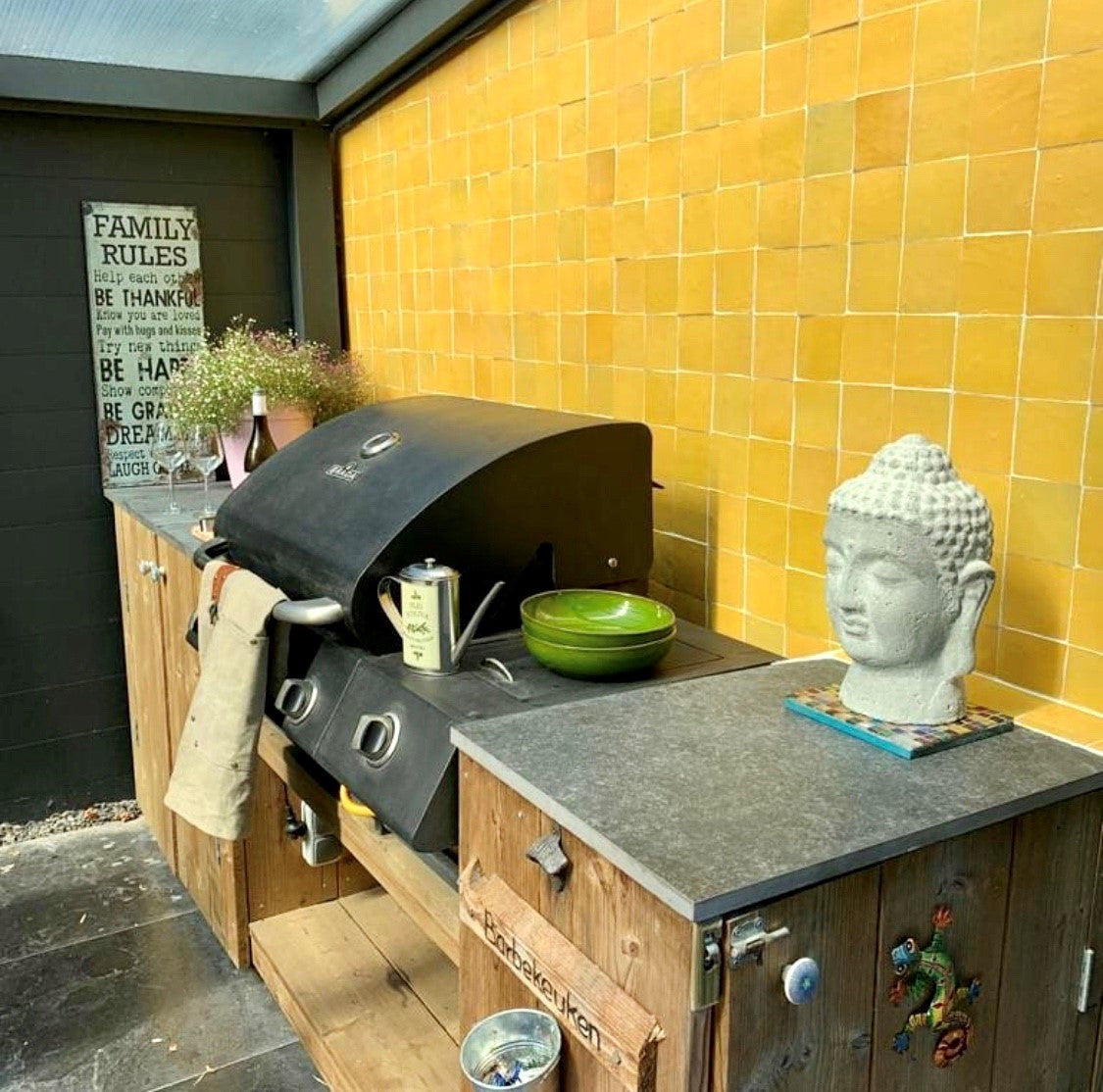 Zellige ES 19 Tournesol 10x10cm is a square tile made of high-quality clay material. It is suitable for both wall and floor use. The tile has a glazed finish, giving it a rustic vintage look. What sets this tile apart is that it is handmade, making each piece unique. It is specially designed for both indoor and outdoor use and is heat-resistant, making it suitable for underfloor heating. With its authentic appearance, the Zellige ES 19 Tournesol 10x10cm adds a touch of vintage charm to any space.Our Zelliges are made in Fez. This Moroccan city is the epic center of Zellige production. The workshop has been making Zellige for 7 centuries. Authentic Zellige can be recognized by the chiseled edges, a lightly glossy glaze sometimes with small imperfections, and a nuanced color palette - no tile is exactly the same. When the Zellige are well mixed and placed, you get a color pattern that can never be achieved with ceramic tiles.