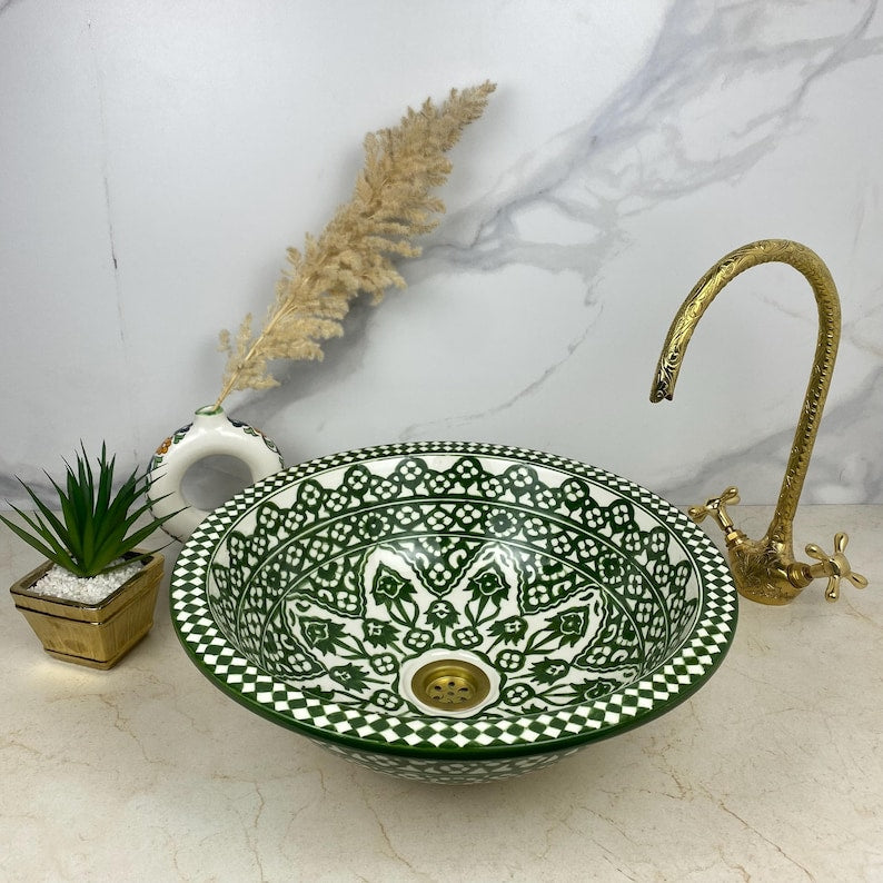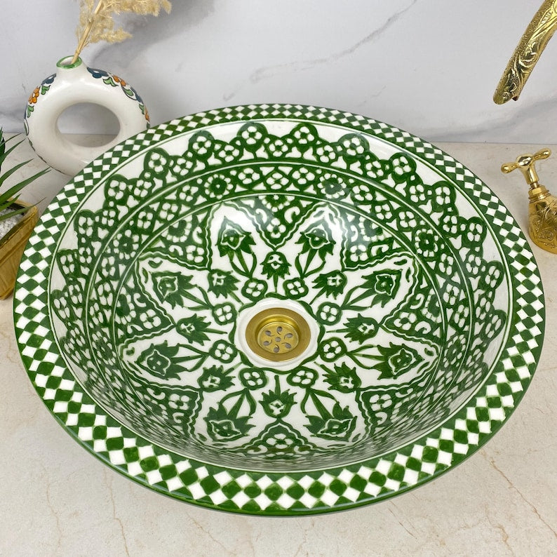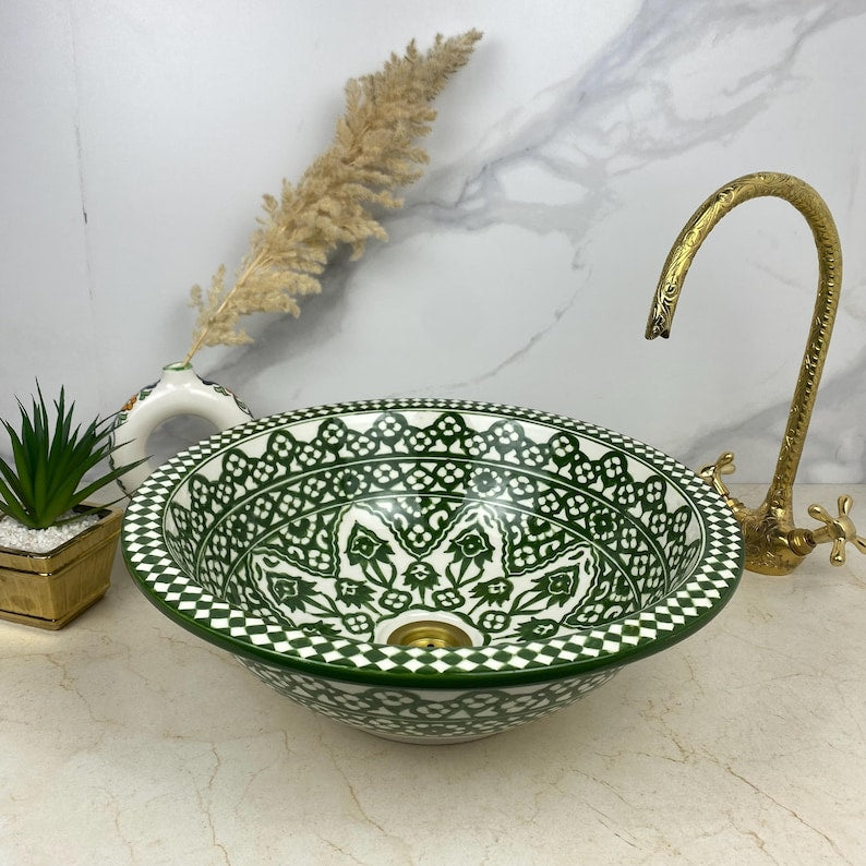 Moroccan ceramic sinks are handcrafted masterpieces that combine functionality with the artistry of traditional Moroccan craftsmanship. Made from high-quality clay, each sink is shaped by skilled artisans who use techniques passed down through generations. Once the clay is molded into the desired shape, it is left to dry naturally before being fired in a kiln at high temperatures to ensure durability. After firing, the surface is meticulously hand-painted with intricate patterns inspired by Moroccan zellige tilework, featuring geometric shapes, floral motifs, and vibrant colors like deep blues, earthy reds, and sunny yellows. The designs are often applied using fine brushes to create precise and harmonious patterns. A glossy glaze is then applied to protect the artwork and enhance its vividness, followed by a second firing to set the finish. These unique sinks are not only durable and functional but also reflect the rich cultural heritage of Morocco, making them a striking addition to any interior space.