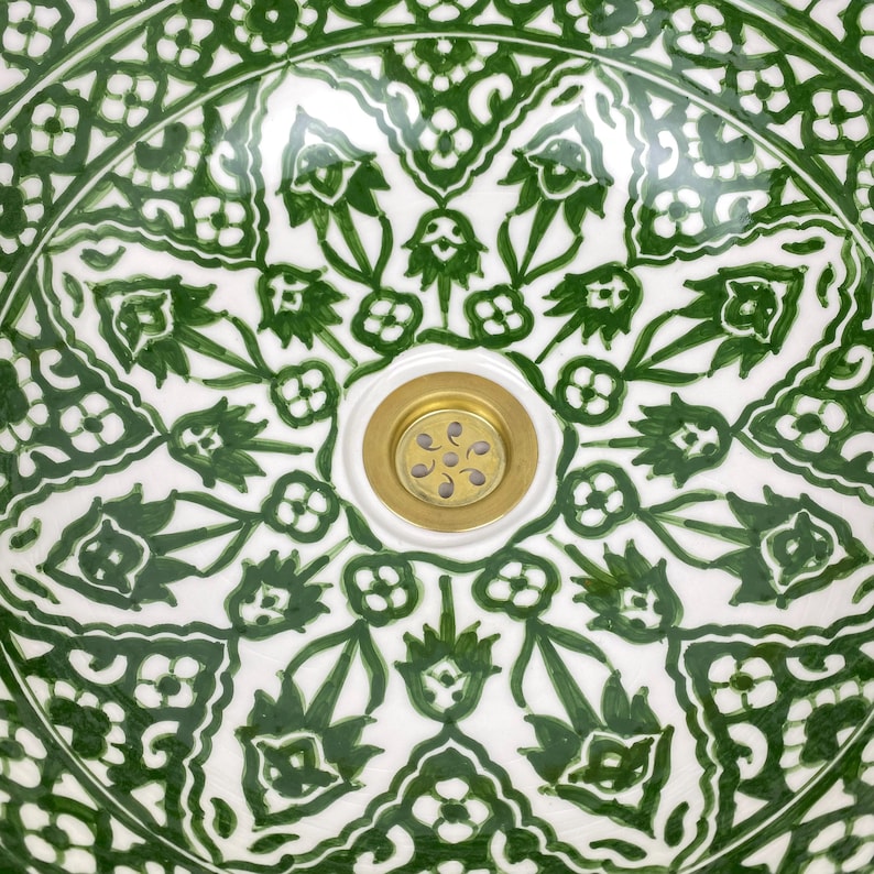 The sinks are adorned with vibrant geometric patterns, floral motifs, or arabesque designs inspired by Moroccan zellige tilework. These patterns often feature a harmonious combination of deep blues, earthy reds, warm yellows, and whites… and also we can customize any pattern or design you need.